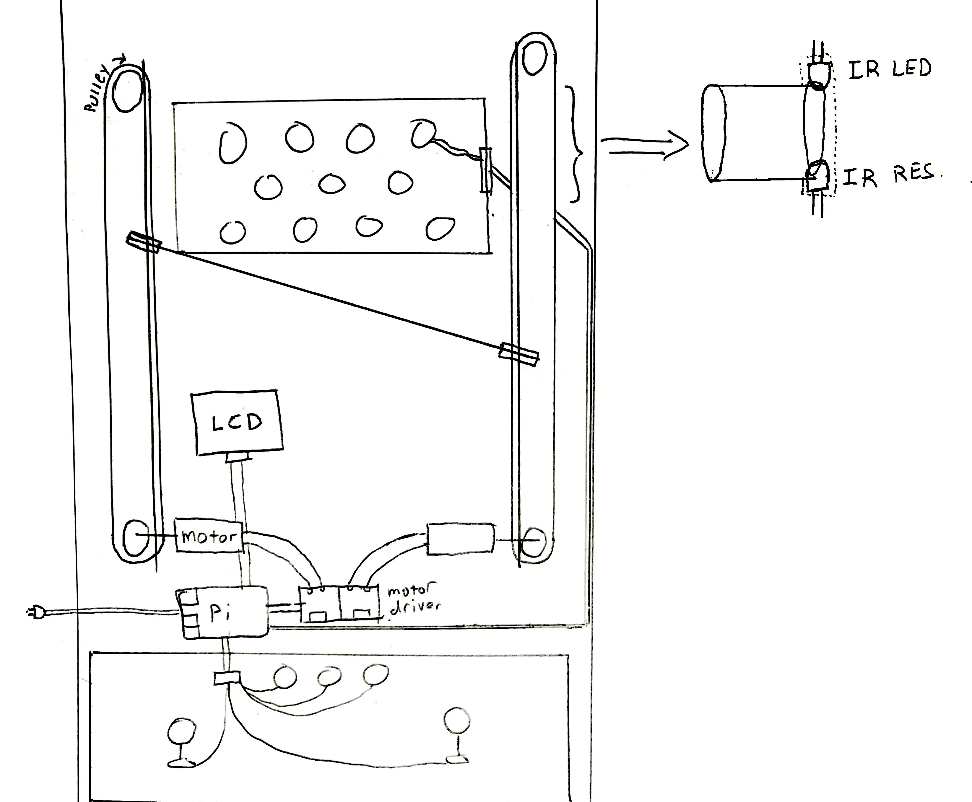 The overall design of the system is quite simple. Two pulleys controlled by motors will move the bar up and down over the board. A small LCD display will display game status, points, menus, etc. The holes will be machined into a removable plate, which will power the lights and IR LED switches. A custom arcade control panel will use the original Ice Cold Beer joysticks and will support a few more buttons than the original game.