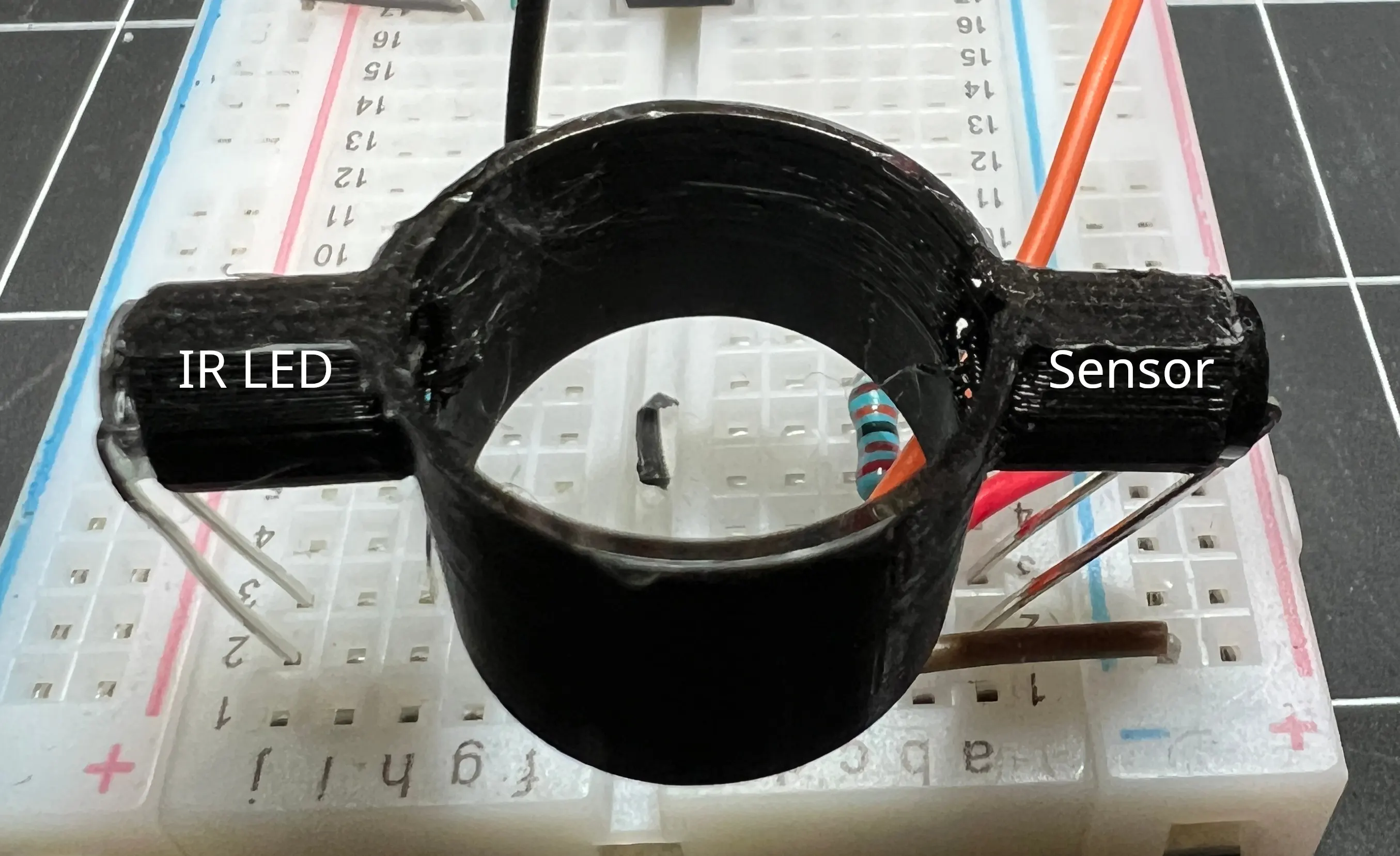 This is a much cheaper solution at $1-2 per switch (cheaper for volume pricing). This method uses an Infra-Red (I.R.) LED and I.R. phototransistor, also known as an I.R. Light Sensor. We 3D print a small housing that fits into the holes in the board. On one side of the housing we mount an I.R. LED, and on the other we mount a sensor. If the sensor sees the light, the ball is absent. If the sensor cannot see the light, there must be something in the way.